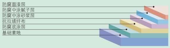 | 中层漆 | 3、铺设玻纤布,将调好的环氧树脂和固化剂倒在玻纤布上,用刮刀刮平,使用防腐环氧中涂漆;用批刀整体满刮1~2遍,待固化后,打磨批刀痕等缺陷处,并清理干净。 | 0.6kg/m2/mm |