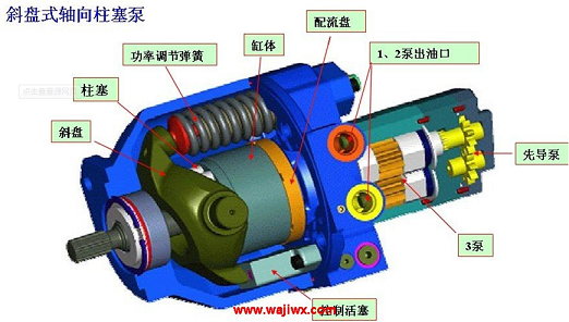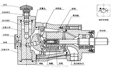 柱塞泵是往复泵的一种,属于体积泵,其柱塞靠泵轴的偏心转动驱动,往复运动,其吸入和排出阀都是单向阀。当柱塞外拉时,工作室内压力降低,出口阀关闭,低于进口压力时,进口阀打开,液体进入;柱塞内推时,工作室压力升高,进口阀关闭,高于出口压力时,出口阀打开,液体排出。当传动轴带动缸体旋转时,斜盘将柱塞从缸体中拉出或推回,完成吸排油过程。柱塞与缸孔组成的工作容腔中的油液通过配油盘分别与泵的吸、排油腔相通。变量机构用来改变斜盘的倾角,通过调节斜盘的倾角可改变泵的排量。