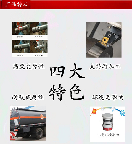 适用于钢铁零件磨损修补及划伤、裂纹等损伤修复。机械强度高;抗磨损,耐酸碱腐蚀;能与金属完美结合。