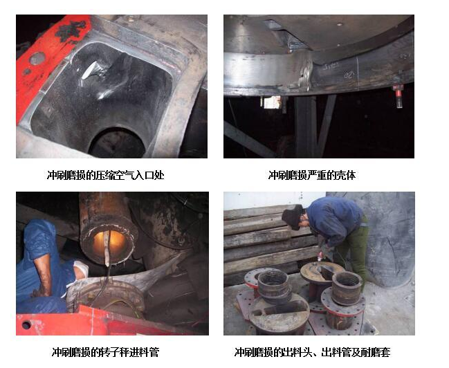 煤粉转子秤进料口、出料口、压缩空气入口、壳体等部位作为输入和输出煤粉的主要设备部件,该部位长期受煤粉的冲击冲刷,严重时可造成部件局部穿孔,使设备造成重大损伤并且影响煤粉计量和存在安全隐患。该类问题长期存在于设备使用过程中,常规的补焊修复工艺加速了部件的报废速度,迫使企业投入高昂的费用采购备品备件,为此企业加大了运营成本。并且企业为此增加很多的?;奔?,严重影响设备的安全连续化运行。