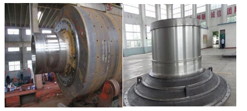 新科机械设备修复中心,经过十几年的实践,总结出了一套有效的解决球磨机进出料口以及端盖磨损的方案。